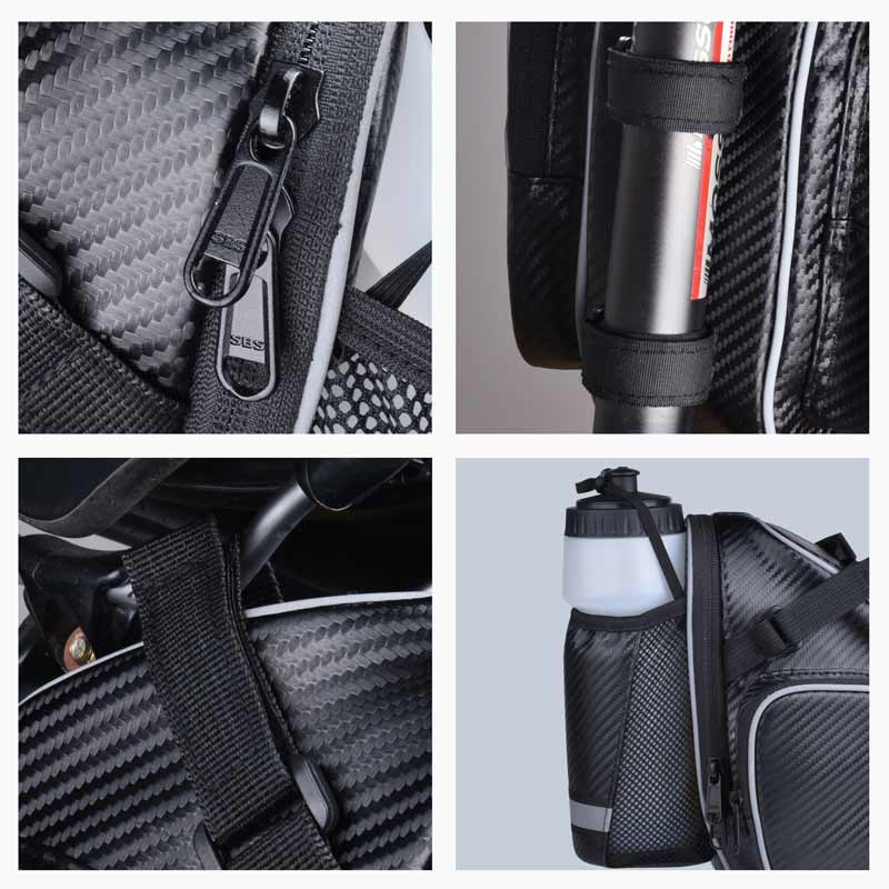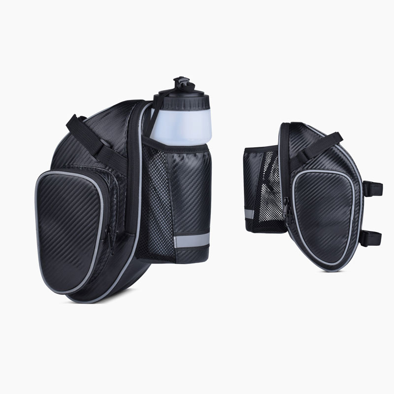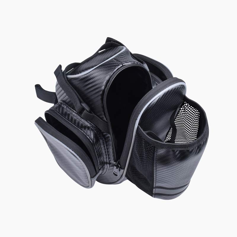 Construction: A zippered main pocket with 2 side pockets and a water bottle holder.