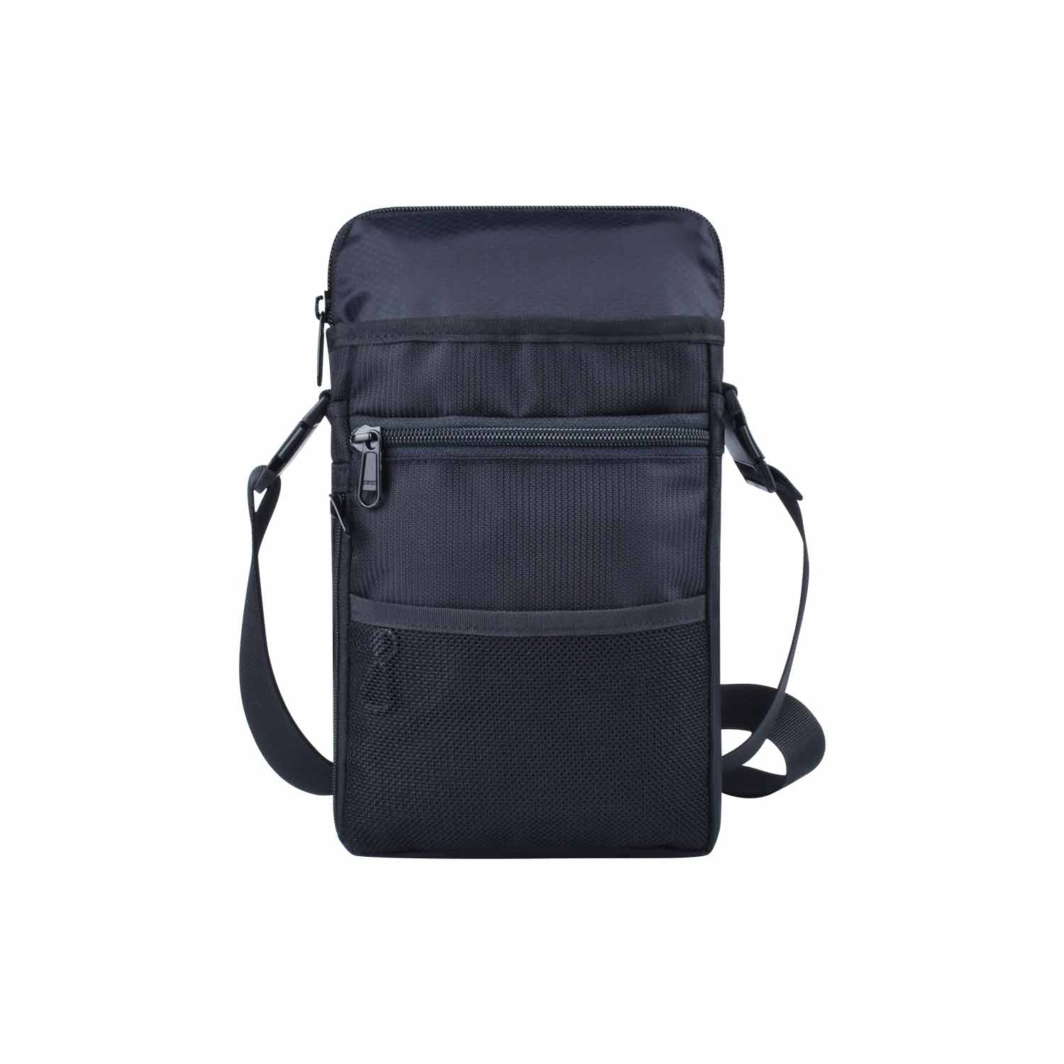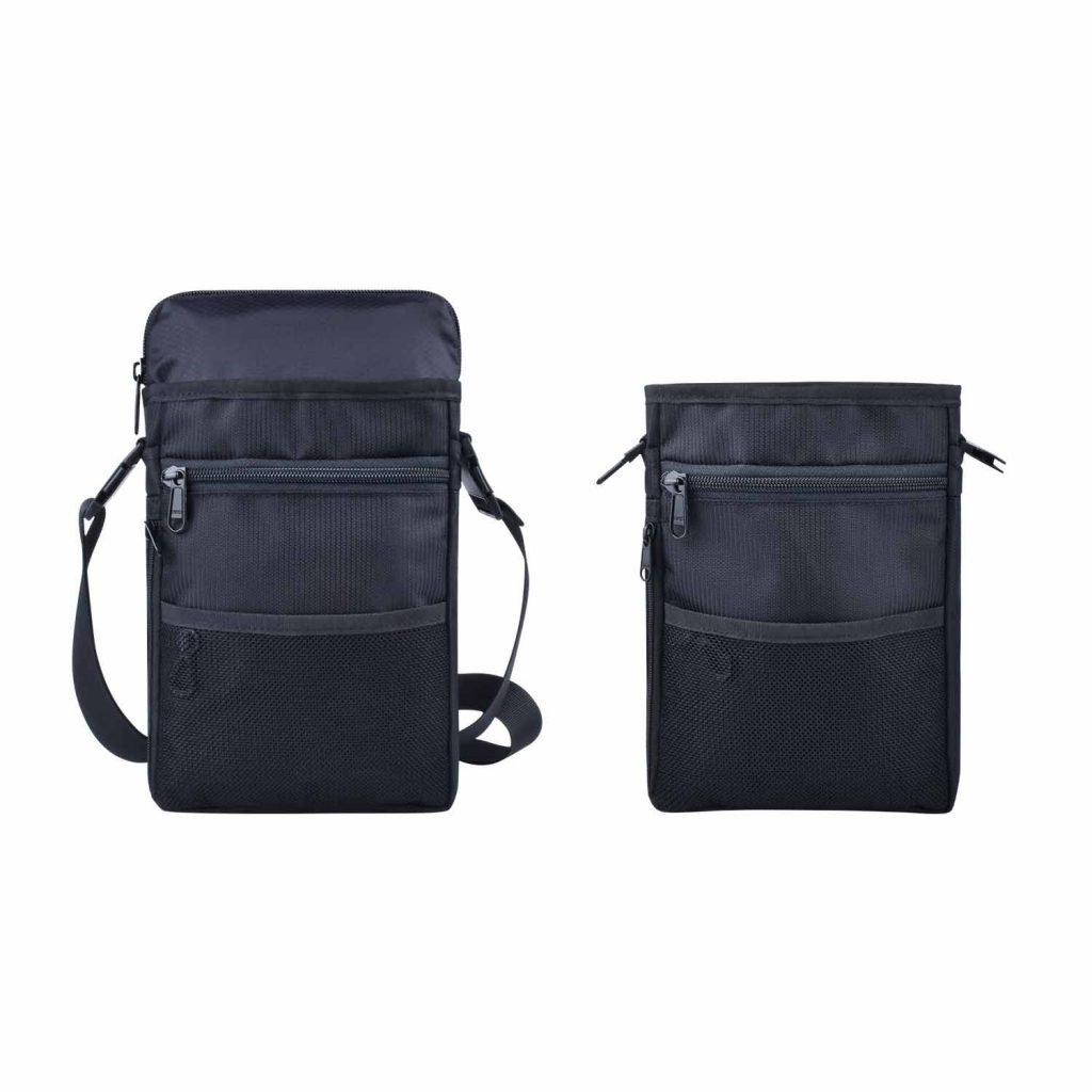 2 main zippered pockets and a mesh pocket in the front. Detachable waist belt & shoulder strap.