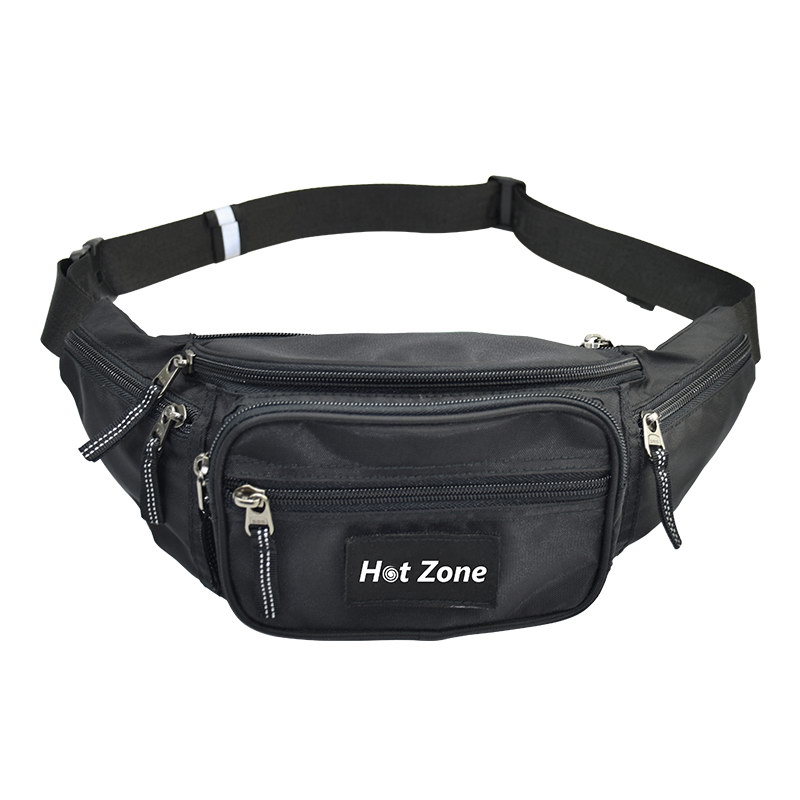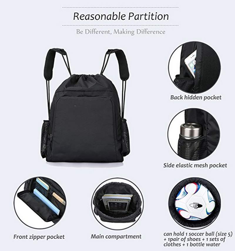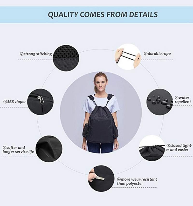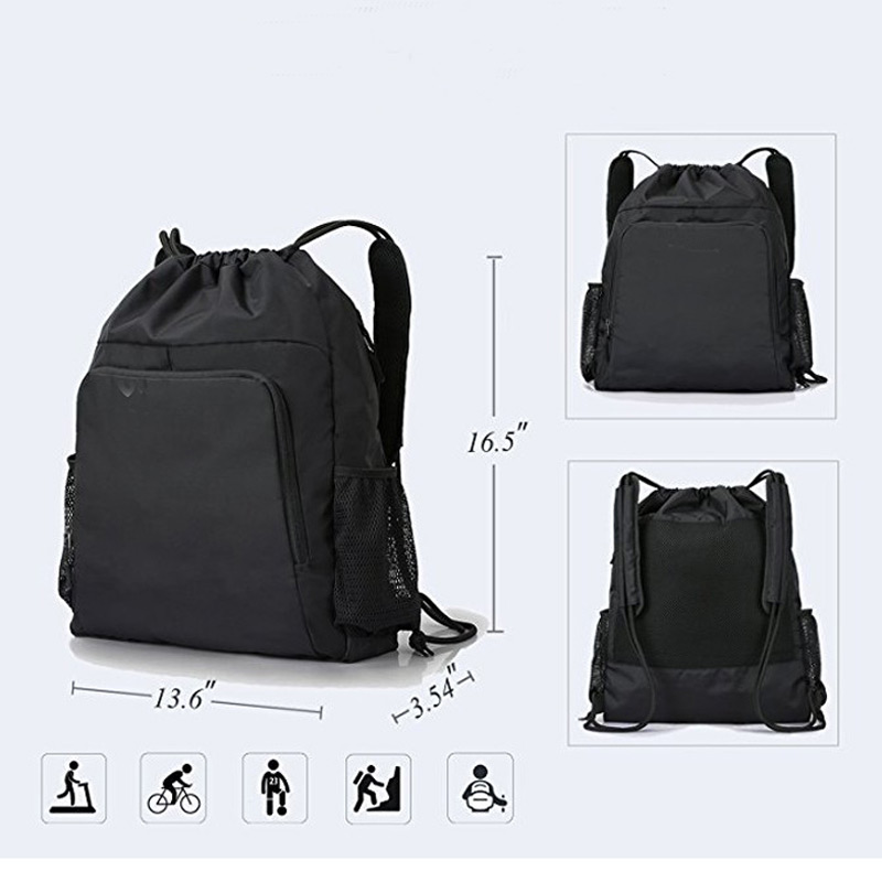 Construction: A main pocket with drawstring closure, and a zippered pocket at the front.